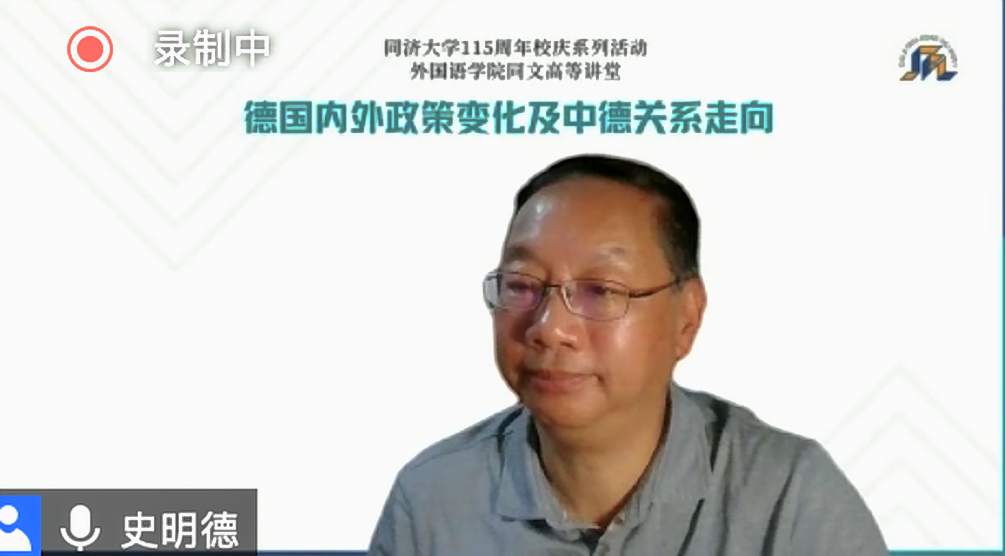5月22日,中国原驻德国大使、中德友好协会会长史明德应邀做客同济大学外国语学院同文高等讲堂,为同济外院师生作了题为“德国内外政策变化及中德关系走向”的线上学术讲座。讲座由外国语学院党委书记郑春荣教授主持。