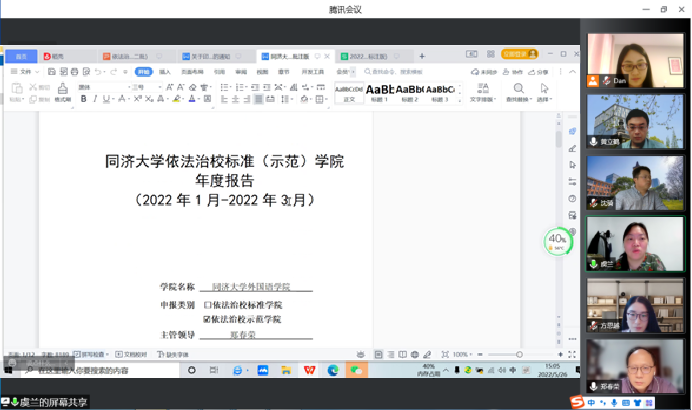 会上,虞兰老师针对学院提交的《同济大学依法治校标准(示范)学院年度报告》初稿有关内容提出了改进建议,并逐一解读了示范学院创建指标。随后,学院参会老师就建设过程中遇到的问题和解决方案展开了讨论。此次培训指导会让参会老师在制度体系建设、内部治理结构、依法依规办学、师生权益保障、法律法规宣传等方面的提升空间有了更深入的认识,对学院创建依法治校示范学院有了更明确的努力方向和更清晰的实施路径。