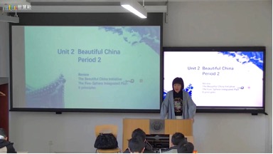 同济大学外国语学院公共英语教学部刘宇翔老师充分利用多模态教学资源,通过视频、图片和思维导图等方式深入浅出地讲述了“美丽中国倡议”“、“新发展理念的五要素”等主题单元的背景、哲理和实践以及推进新时代生态文明建设的六原则。两校学生在老师的引导下积极参与形式多样的“云端互动”,课堂气氛活跃,新颖的授课方式有效地激发了学生们的学习热情,产生了思维的碰撞,携手讲好中国故事。
