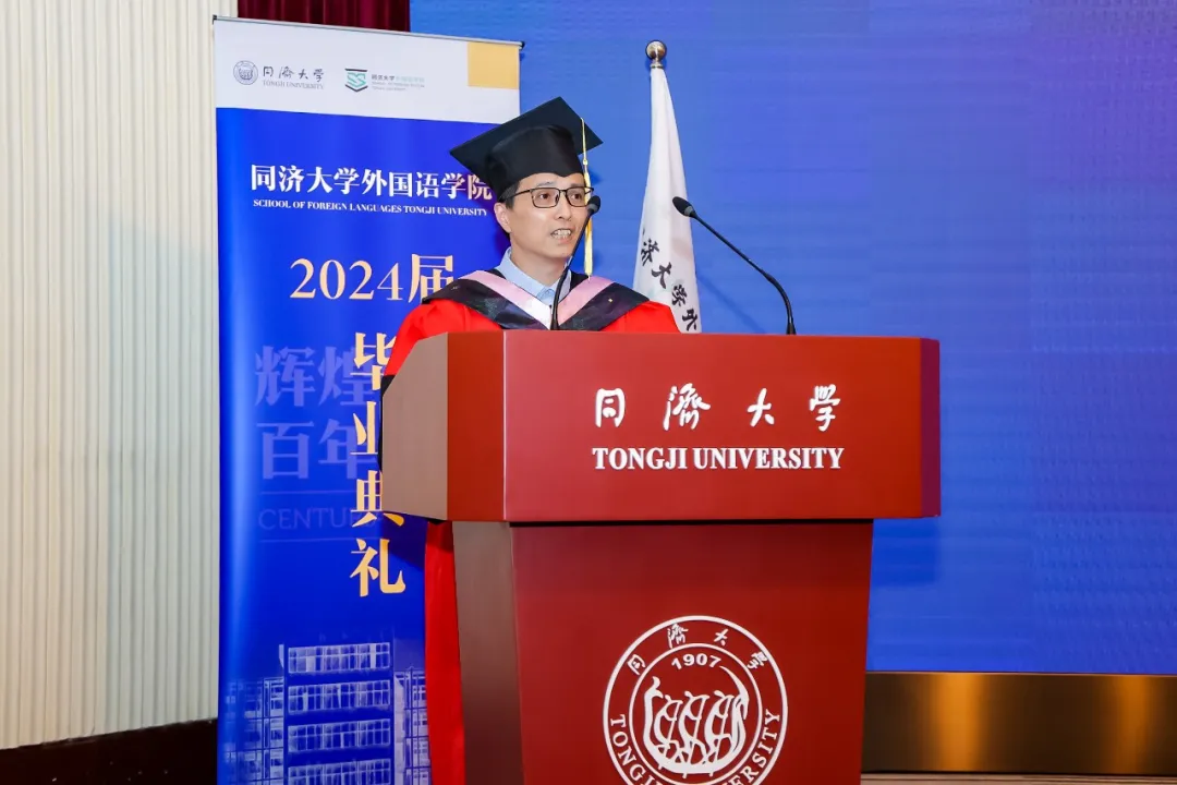为青春代言,向世界发声。今天下午,同济大学外国语学院2024届毕业典礼在逸夫楼一楼报告厅隆重举行,欢送2024届毕业生奔赴世界各地。学院党委书记郑春荣教授、院长吴贇教授、党委副书记、纪委书记宋波老师、党委副书记李疏贝副教授、副院长王蓓蕾副教授、副院长胡琪副教授、英语系主任杨小虎教授、德语系主任伍慧萍教授、教师代表周峰副教授和团委书记刘佳煊老师、学生工作办公室副主任李伟伟老师、团委副书记王雨辰老师,以及部分学院教职工、毕业生家长等出席毕业典礼。郑春荣主持毕业典礼。典礼开始前,毕业生代表演唱了毕业主题歌曲。