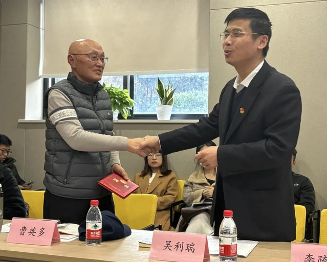 活动最后,吴利瑞部长再次感谢曹英多老师二十年来持续关心青年学生的成长成才,发挥老党员“退岗不褪色,离休不离心”的奉献精神,并为其颁发“同济大学外国语学院红色‘济’忆领航员”聘书。