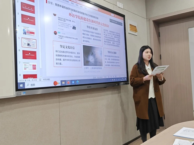 本科生党支部书记李伟伟、党员徐晓蕾、研究生第一党支部支委褚天卓分别汇报了支部建设及“对标争先”项目开展情况。本次项目以“历史中的同济外语人”为抓手,看、访、听、讲、译多模态一体,立体化讲述同济外语人革命故事,鼓励党员同志进一步学习前辈奋斗精神,感悟榜样力量,助力红色文化对外传播,以实际行动迎接学校党代会的胜利召开。