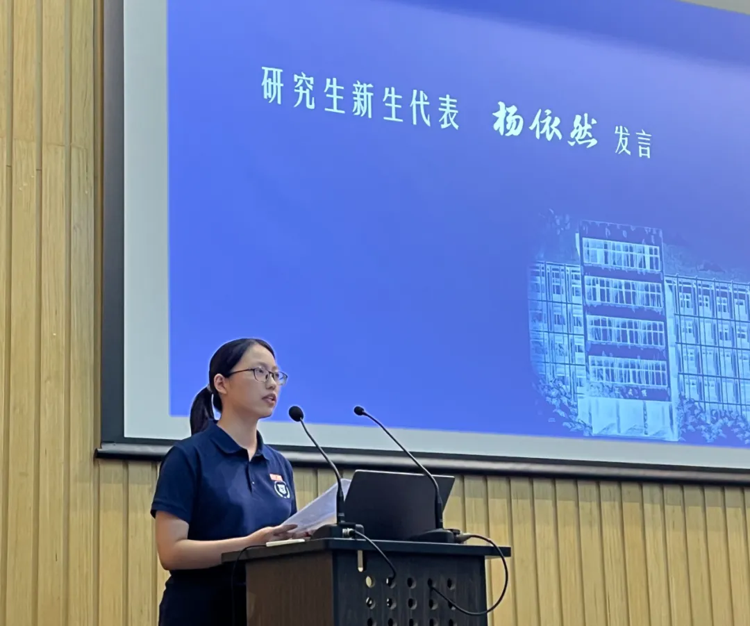 杨依然作为研究生新生代表发言。她讲述了自己选择同济外院的初心。她呼吁同学们将个人理想与祖国需求结合,践行“同济天下,崇尚科学,创新引领,追求卓越”的新时代同济文化,为实现人生目标和社会发展贡献力量。