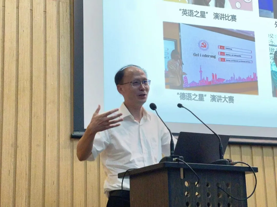 德语系教授吴建广作为教师代表发言。他向2024级新生表示热烈欢迎。他从百年外语的厚重历史和文化底蕴出发,向同学们阐述了身为外语人应有的情怀和应负的责任。他结合自身丰富的一线教学及海外访学经历,与同学们分享了学习外语的经验,并鼓励同学们利用好学校提供的优质学习资源,做一个立场坚定、视野开阔、能力坚实的同济外语人。