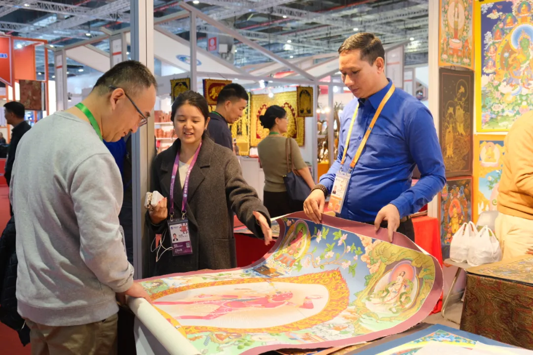 我院冯叶寒同学参与翻译与讲解服务的展台是来自尼泊尔的唐卡艺术展商。尼泊尔唐卡是一种历史悠久的传统艺术形式,起源于公元7世纪的尼泊尔,它以其工笔重彩、描绘精细的独特艺术手法,带给人们精神愉悦和心灵感应。手绘唐卡使用喜马拉雅天然矿物质颜料和金箔,使色彩鲜艳持久,细致的线条和笔触表现微小的纹理和细节,使画面生动逼真。这些特点不仅展示了尼泊尔唐卡的艺术价值,也使其成为人类文明的重要组成部分。