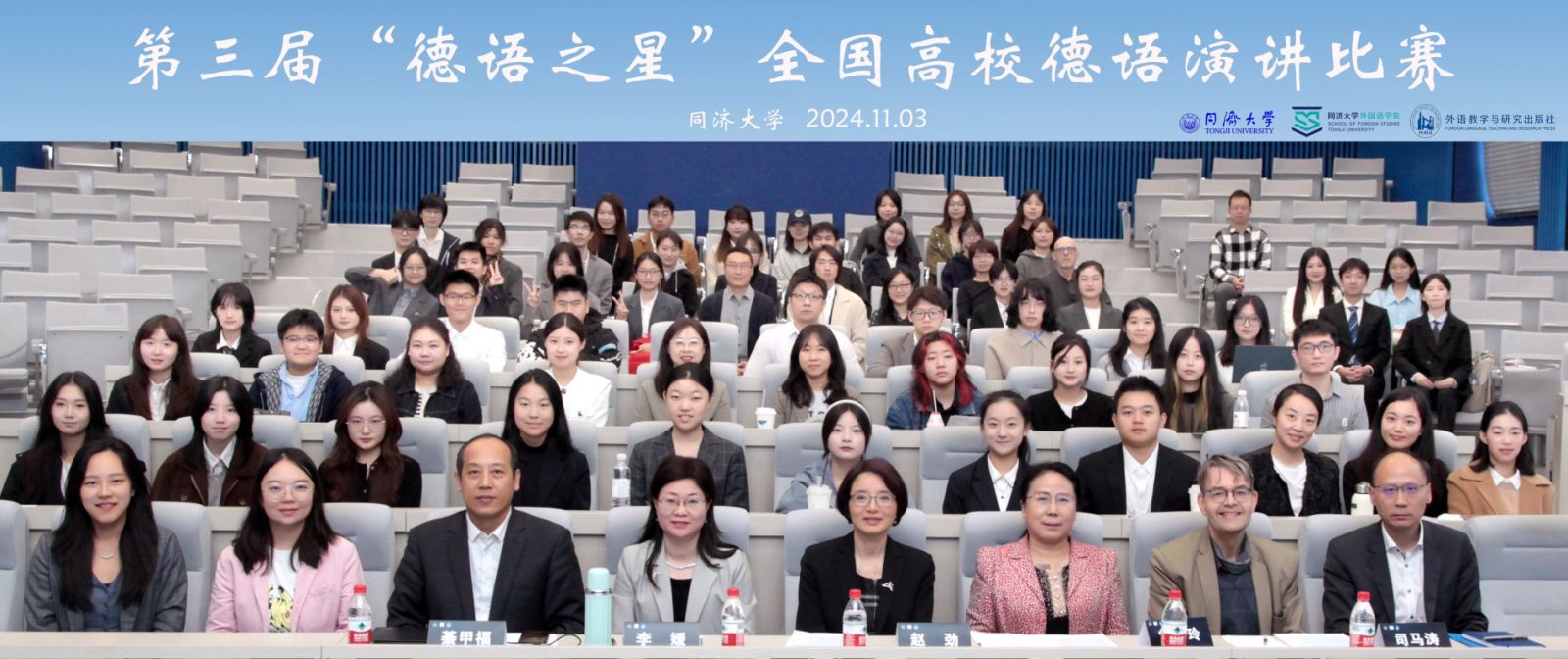 2024年11月3日上午8时,第三届“德语之星”全国高校德语演讲比赛决赛在同济大学文远楼106报告厅正式拉开帷幕。本次比赛以“科技创新与教育发展”为框架性主题,倡导选手从学习者的视角出发,基于真实大学生活和切身经历,讲述科技赋能下的个性化学习体验、功能需求、问题思考与未来展望。比赛瞄准2035年建成科技强国和中国教育现代化的战略目标,致力促进学科建设和人才培养对接国家发展战略,为德语学习者提供一个展示风采、交流互鉴的平台。
