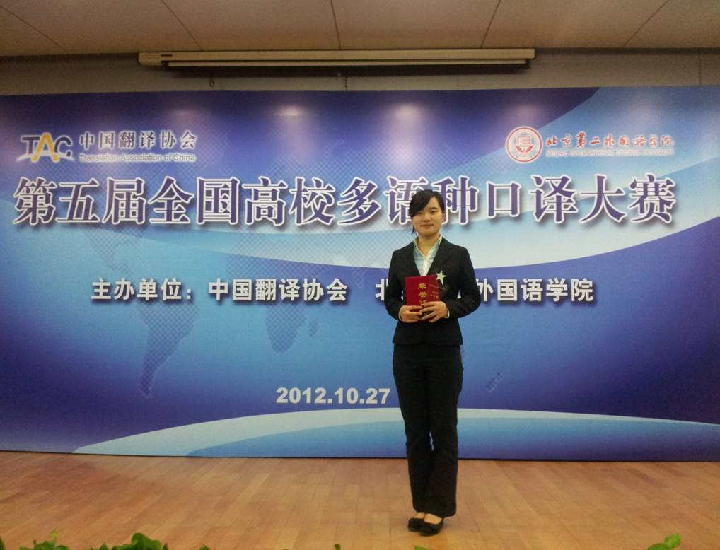 由中国翻译协会主办、北京第二外国语学院共同主办的“第五届全国高校多语种口译大赛”决赛于2012年10月27日在北京第二外国语学院落下帷幕。来自北京大学、北京外国语大学同济大学等35支高校代表队、共79名选手参加了日语交替传译、日语同声传译、法语交替传译、德语交替传译、俄语交替传译、韩语交替传译六个竞赛单元的比赛。