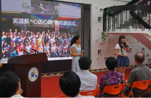 典礼最后是传递“心语心愿”瓶环节,日语、德语、英语系的新生代表将盛满他们心愿纸条的心愿瓶递交给各系负责人,希望在以后的四年里,在院系老师的带领下,能够实现他们的愿望。