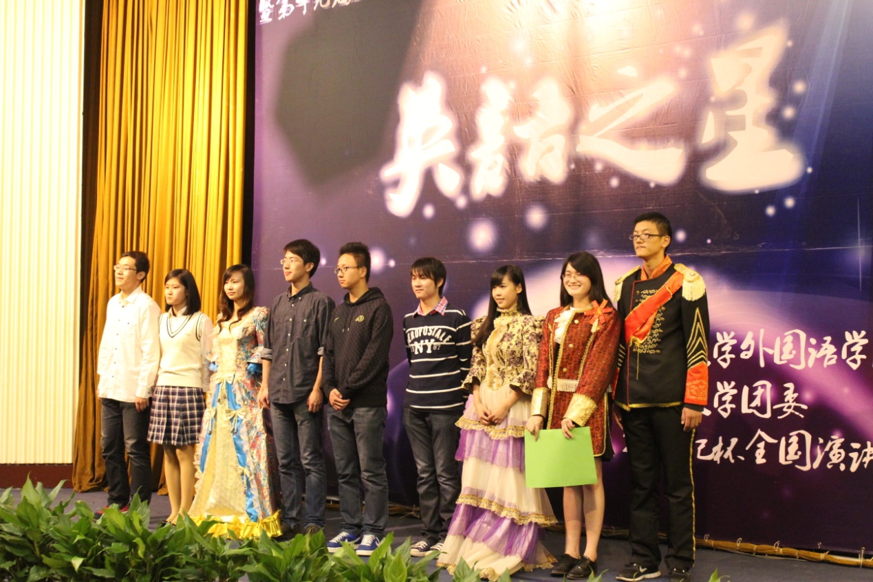 决赛分为两个环节:既定演讲与视频解说。经过初赛、复赛的层层选拔,来自全校各专业的10名选手进入了决赛,进行了激情演讲,给在场观众呈现了一场精彩的英语盛宴,充分展现了同济学子的英语综合能力及良好风貌。除了既定演讲,本届大赛采用了视频解说的新形式,在锻炼选手即兴解说能力的同时,也为英语第二课堂活动做了新的探索,受到了评委老师的一致好评。最终,来自外国语学院的11级英语系研究生蒋丽娥同学赢得了2013年同济大学“英语之星”风采大赛冠军;亚军、季军获得者分别是来自13级临床医学的张晓申同学和12级化学系的阎子贺同学;最佳人气奖则由同样来自于外国语学院12级英语系的苟冰冰同学获得。