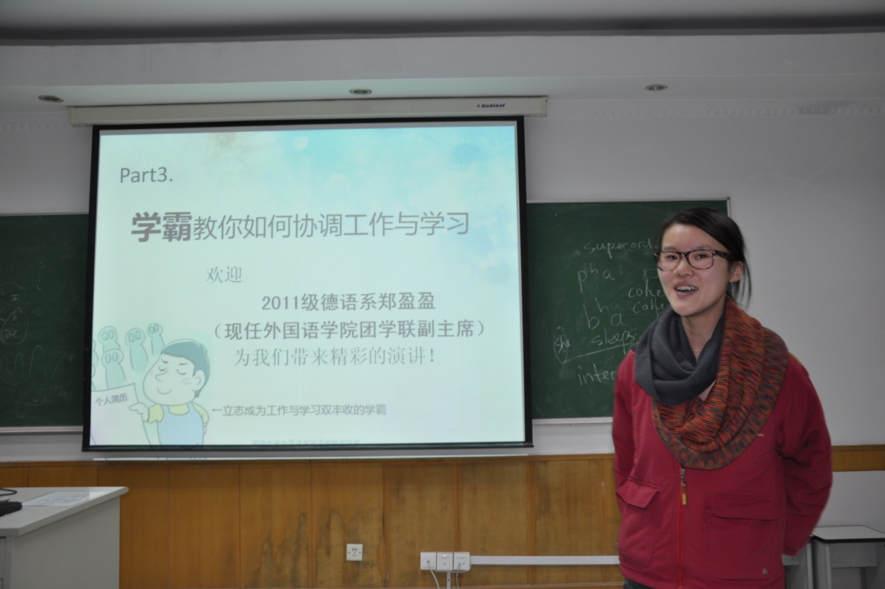 2013年11月21日18:30,外国语学院第二次团干部基础素质培训在汇文楼218举行。此次培训以策划案编写培训和协调工作与学习为主题,旨在引领新干事们能更好地开展工作,也能在工作中得到更多收获。本次培训邀请大二德语系的孙敏婕和大三德语系的郑盈盈两位主讲人,为大家带来了有趣又有意义的培训。