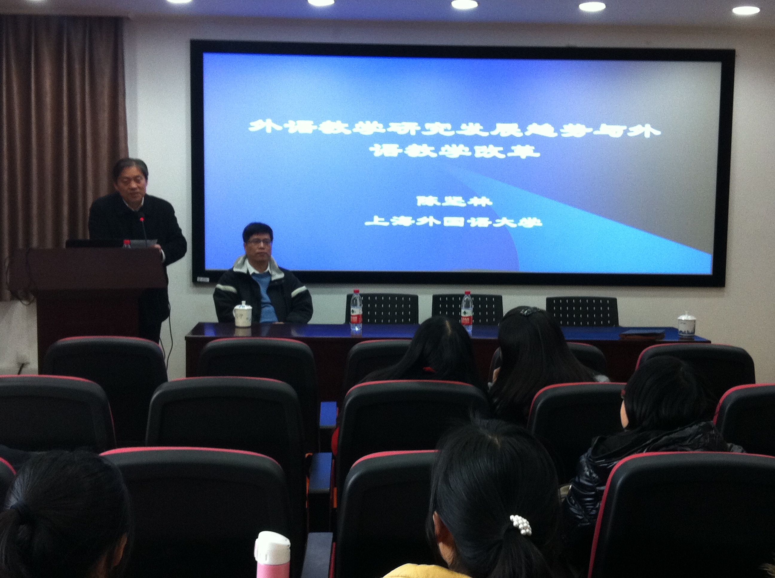 陈教授不仅是上海外国语大学的教授、博导,还担任上海外语音像出版社/上海外语电子出版社社长,国家级外语学术刊物《外语电化教学》副主编,上海教育技术协会外语专业委员会主任会长,中国音像协会副主席,在教学和教学研究方面成果丰硕。在报告中,陈教授鼓励在场师生进行教学理论的研究和教学实践的反思与改进,要与时俱进,不断创新,为教育现代化做出自己的贡献。讲座后,陈教授还就大学英语教学改革问题、教学研究问题、外语的地位与前途问题等大家关系的议题进行了热烈的互动和讨论。