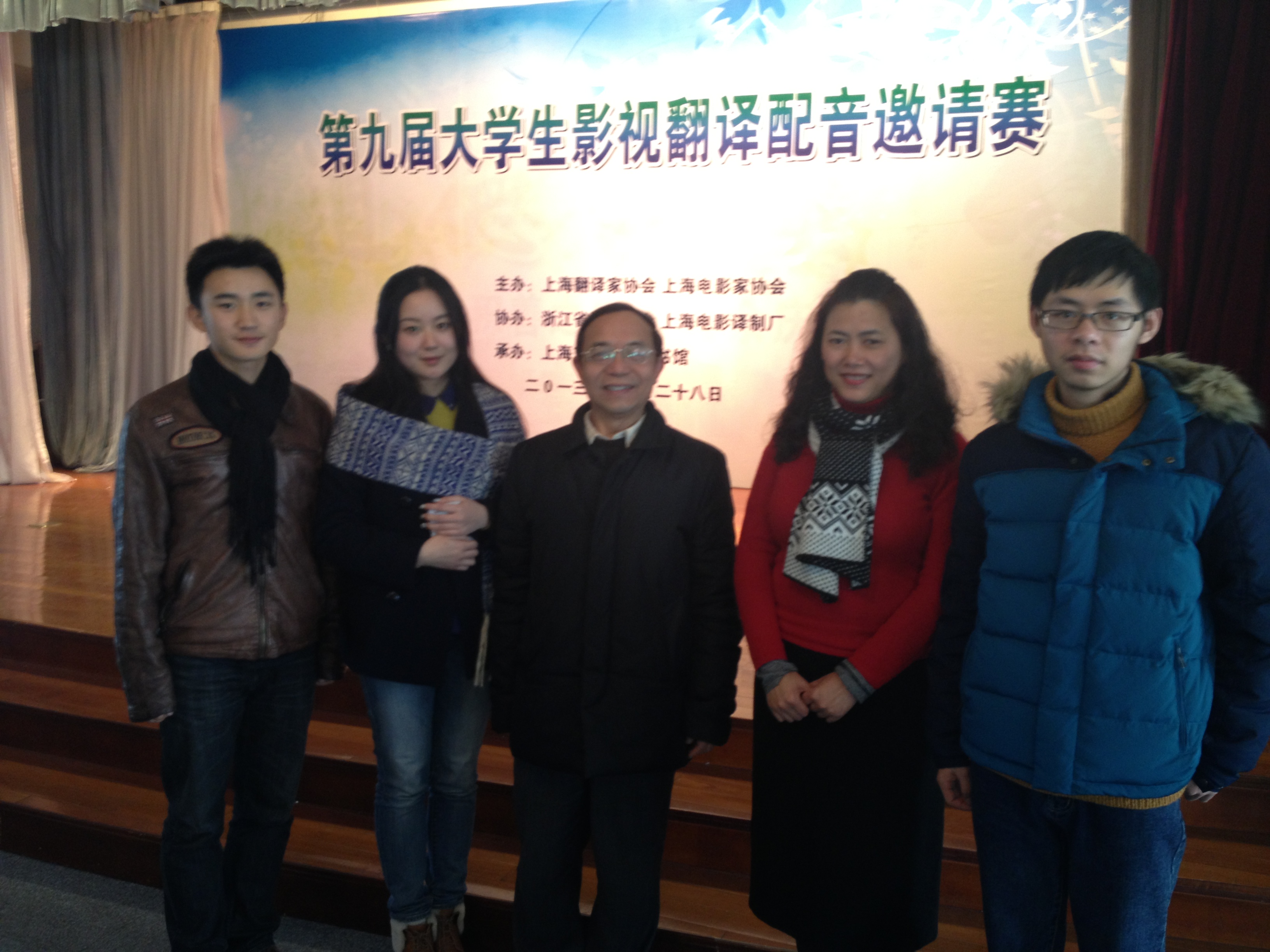 由上海翻译家协会、上海电影家协会主办,上海电影译制厂协办的第九届大学生影视配音翻译邀请赛于2013年12月28日上午9点在长宁区图书馆10楼举行,本次比赛中,同济大学的2010级学生周昭宇和英语系2012级学生林子荣获配音表演一等奖,英语系2013级学生杨乾雄荣获剧本翻译二等奖,我院英语系副教授何继红老师荣获“最佳指导奖“。