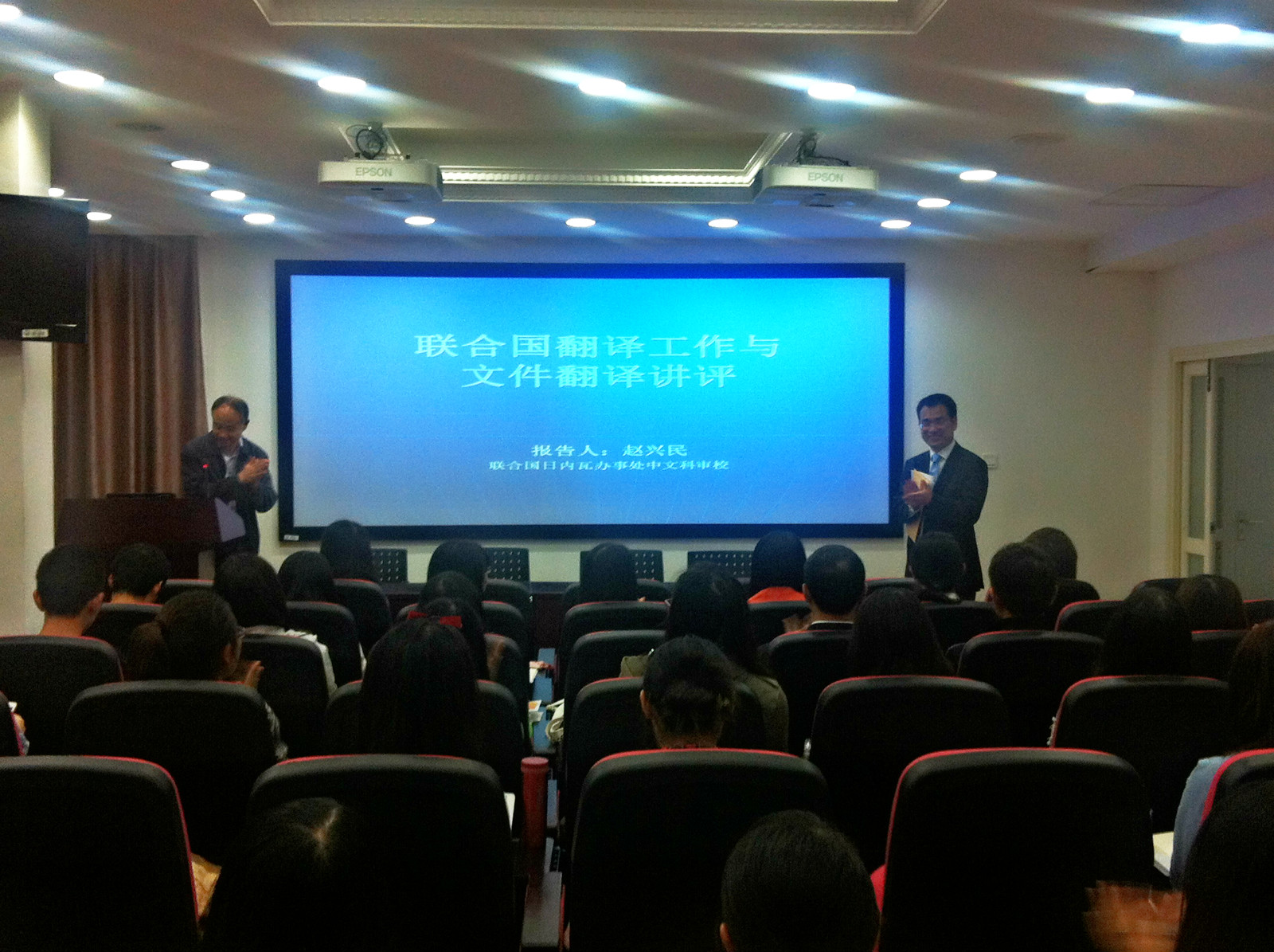 赵老师首先从联合国的翻译工作以及办事处的笔译部门谈起,引起了在座师生的广泛兴趣。随后又对联合国中文翻译的历史进行了简要回顾,对笔译员的工作流程、职责要求以及业绩考核进行了简单介绍,让同学们明白了联合国的翻译人员肩上承担的重任以及如何才能成为一名优秀的笔译员。接下来,赵老师又分析了造成理解与翻译困难的诸多因素并对联合国未来的翻译走向作了讲解。最后,也是整个讲座的高潮,赵老师对同学们事前翻译的法律文件作了详细的点评,并对其中的难点一一解释,期间赵老师还与同学们进行了亲切的互动。
