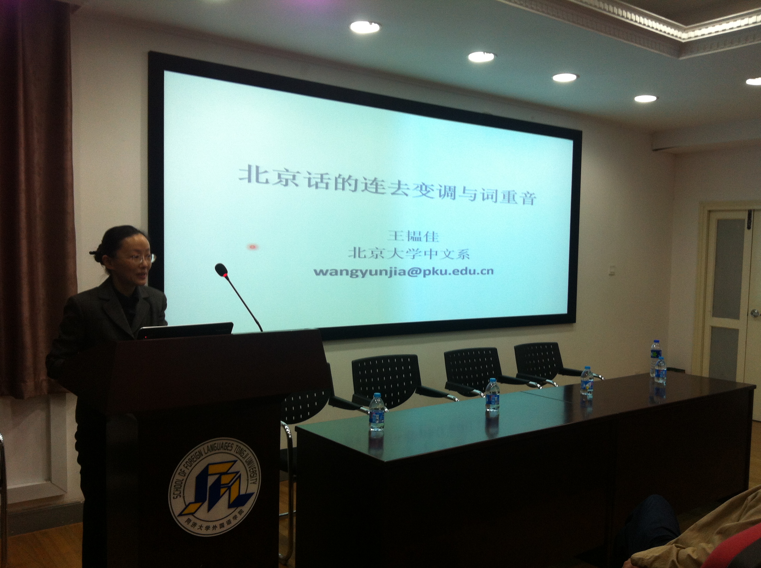 王韫佳教授的报告主要围绕北京口语中,去声连读两字组存在的三种变化形式展开,探讨其发生连读变调的动机和成因,提出连去变调的形式与重音有关的假设。由于口语语料的采集十分困难,该研究并没有选择传统的田野调查的方法,而是利用电视剧对话中的连去组合,通过变调判断、变调字组选择、北京人发音认同等过程选择出用于确认重音模式的变调字组。通过重音判断实验得出,变调两字组的后重比例为100%,而相应的未变调样本的后重比例为61.8%,王韫佳教授对未变调样本后重率低的原因进行了详细的解释。在讨论部分,王韫佳教授对可变调和重音之间的关系展开探讨,认为重音决定变调的形式,而连去组合中前调由降调变为升调和后变式中的后降调变为低降调都是发音省力导致的同化作用触发的。该研究的结果也为北京话双音节词存在前重和后重的区别提供了证据。