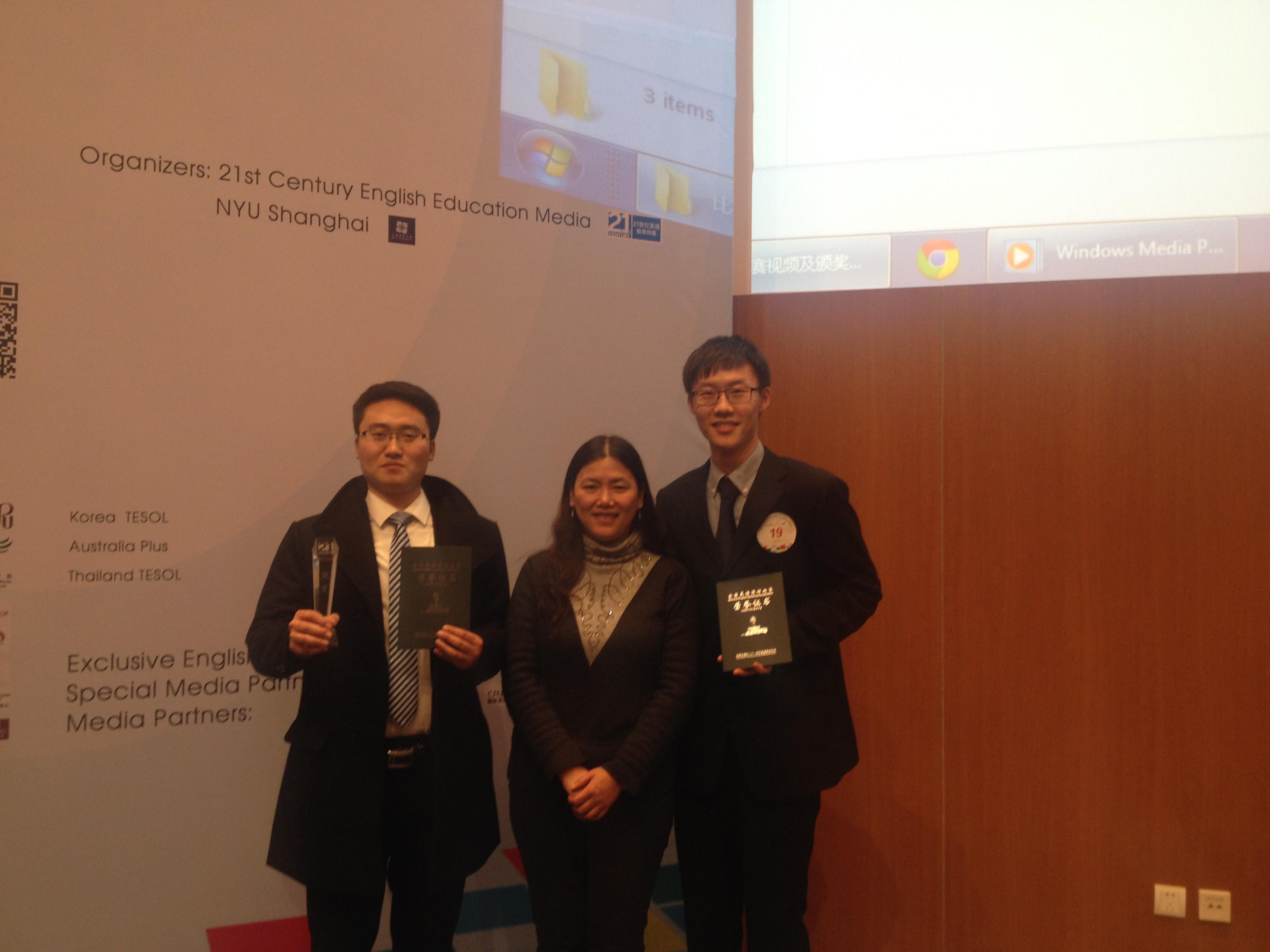 本次同济大学队选派的两位选手来自2014年同济大学“英语之星”校园选拔赛的特等奖和一等奖选手。曹帅同学作为上海赛区特等奖的冠军得主,将与亚军(上海外国语大学队)、季军(上海纽约大学队)和一等奖的第一名获得者一起代表上海参加2015年3月的全国赛。