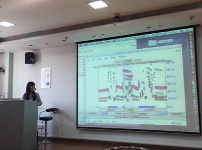 王婷同学还多次讲解使用Praat做语音研究与分析,例如如何使用元音舌位图研究中美学生朗读元音的差别,各种方言在元音发音上的差异等内容。这些理论结合实际学术研究的讲解方式让在场同学受益匪浅。