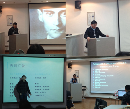 本次创新论坛主要邀请到了经管学院博士生耿裕清、人文学院硕士生刘?家、国政学院硕士生党金奎以及外国语学院硕士生王君健共四位同学作主题报告。首先,人文学院的刘?家同学从文艺学角度入手通过比较残雪的《山上的小屋》与卡夫卡的《变形记》两部作品,深入浅出地给大家讲解了其共同反映的家庭环境与人际关系的“变形”。然后,国政学院的党金奎从“我眼中的国际政治” “当今中国外交中的矛盾现象”“我对中国当前外交的看法”“对上述矛盾现象(假象)的原因分析”四个方面向我们阐述了如何看待当前中国外交中的矛盾与困惑。经管学院耿裕清同学则以两则招聘广告入手,结合具体的实例,积极和同学互动,轻松幽默地带领我们真正领悟跨文化交际背景下的人力资源管理理念。最后,外国语学院王君健同学向大家介绍了外贸中的英语函电、单证英语、国际贸易术语,帮助大家初步熟悉了外贸英语的应用。