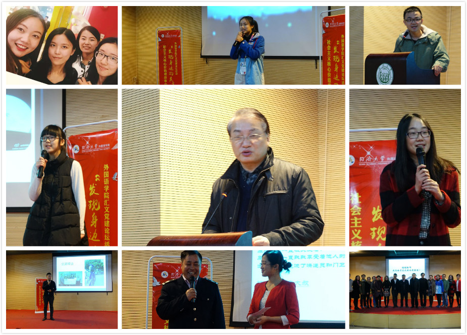 12月22日下午,由同济大学外国语学院本科生党支部和研究生党支部依托学院党建品牌活动“汇文党建论坛”共同发起的“发现身边的美――社会主义核心价值观故事会活动”在经纬楼三楼报告厅举行。校党委副书记徐建平、学生工作部部长陈华、外国语学院党委书记李立贵、外国语学院党委副书记花艳、学生处田苏宏、学院辅导员王小莉、黄立鹤、吴晓培老师出席了本次活动,外国语学院的学生党员、入党积极分子以及2014级部分同学参加了本次活动。