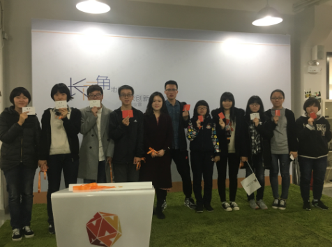 9:30毛主席像前,新生成长学校的成员们集合,绑上丝带,举起小旗子,一群人向彰武路校区的创业谷进发,进行第一站“鲜橙破冰”。在创业谷大厅,新生和学长姐们互相进行了自我介绍,并且进行了破冰游戏。最后,采用丝带牵手的方式,学长学姐和新生结对,并由学工办张绣宇老师问他们分别颁发了“优秀学长姐证”和“笃志宝宝证”。