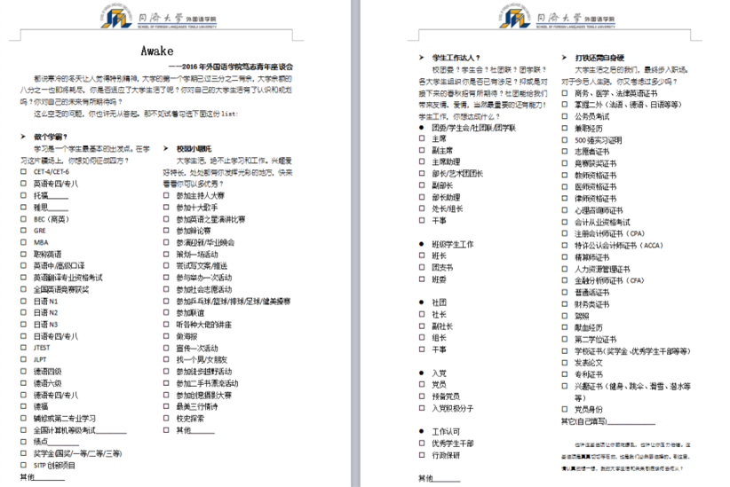 在座谈会的开始,张绣宇老师分发了一份特别的“考卷”让新生们勾选。试卷的名称叫Awake,是想在适当的压力下,给新生们提前梳理大学,树立时间规划意识。