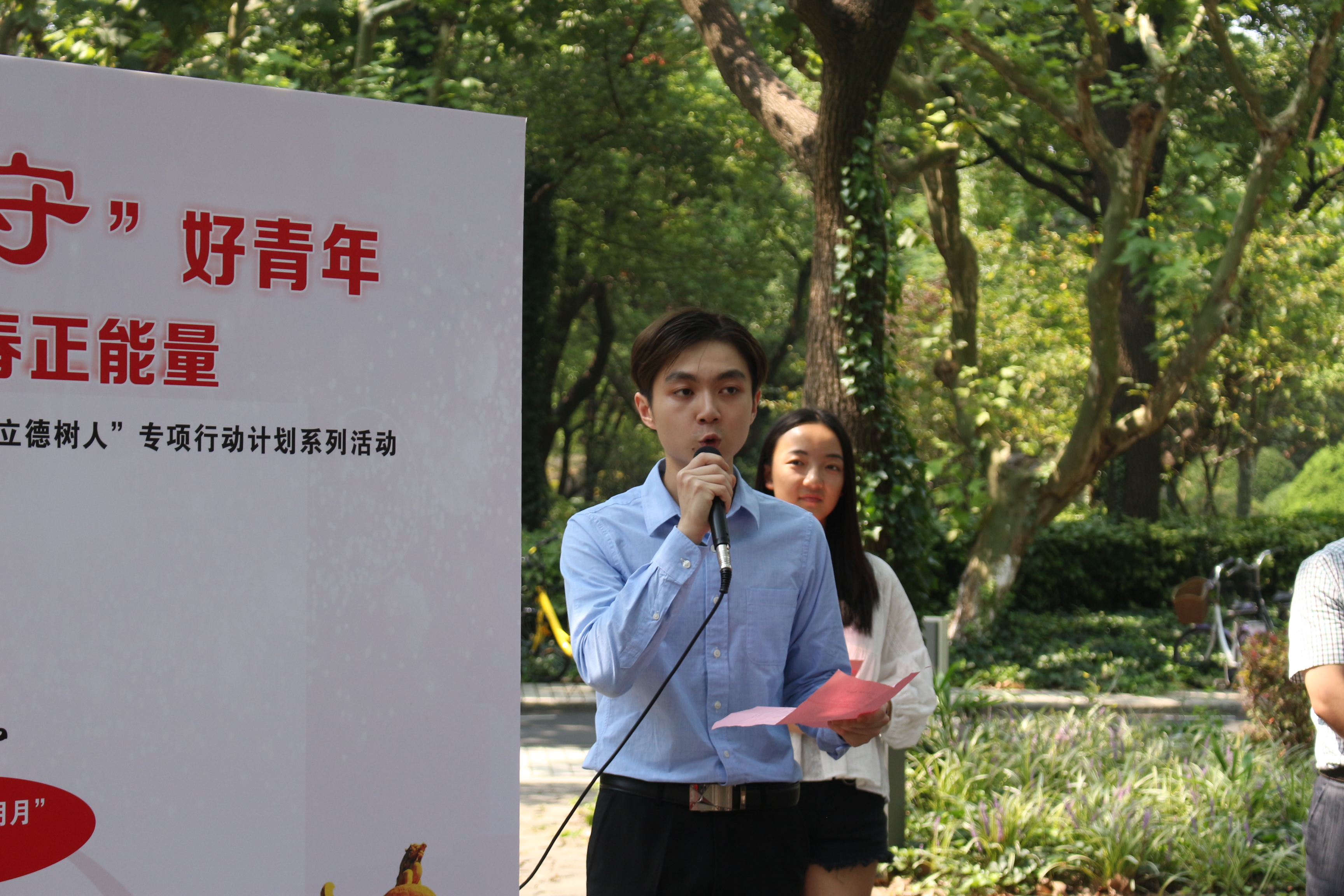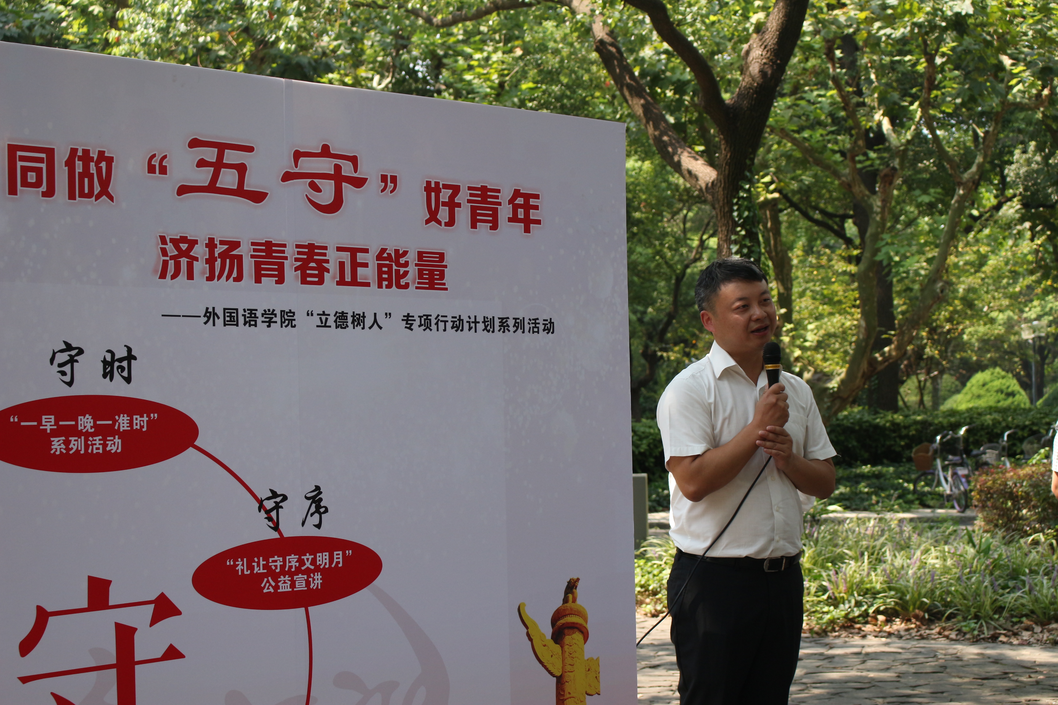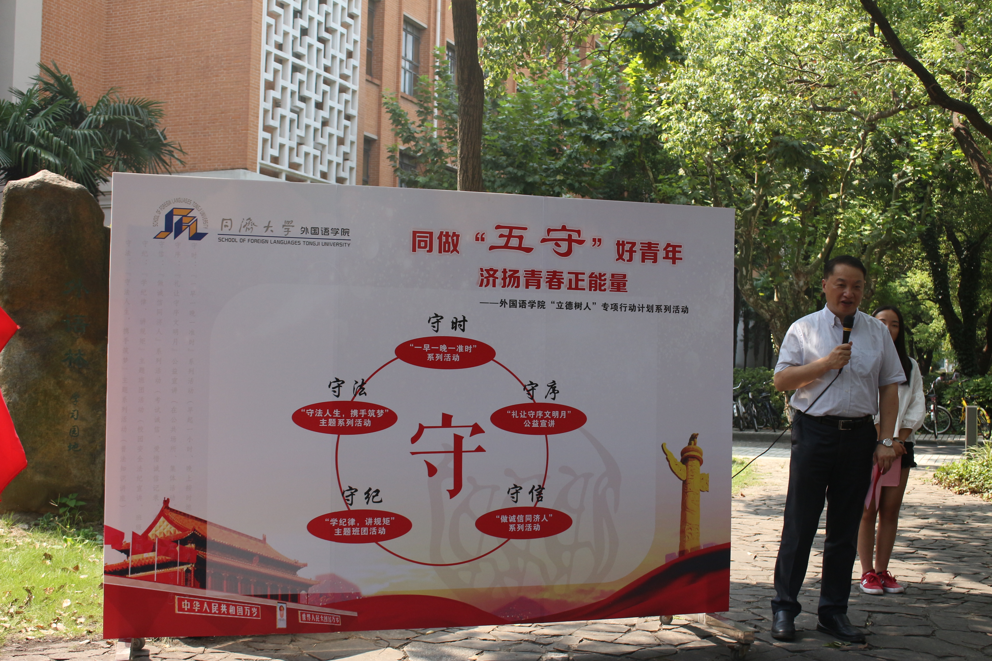 9月18日,由同济大学外国语学院举办的 “同做’五守’好青年,济扬青春正能量” “立德树人”专项行动计划系列活动的启动仪式在外语林准时开幕。此次活动为进一步贯彻全国高校思想政治工作会议精神和习近平总书记关于“立德树人”的重要论述,响应同济大学“立德树人”专项行动计划,及时面向全体学生开展“守时、守序、守信、守纪、守法”教育。同济大学党委副书记徐建平、党委学生工作部、研究生工作部部长刘润、外国语学院院长吴?、外国语学院党委副书记、纪委书记魏铀原、外国语学院副院长董?、留学生办公室主任与禹昱、外国语学院英语系系主任魏耀章、英语系副系主任黄立鹤参加了本次仪式。