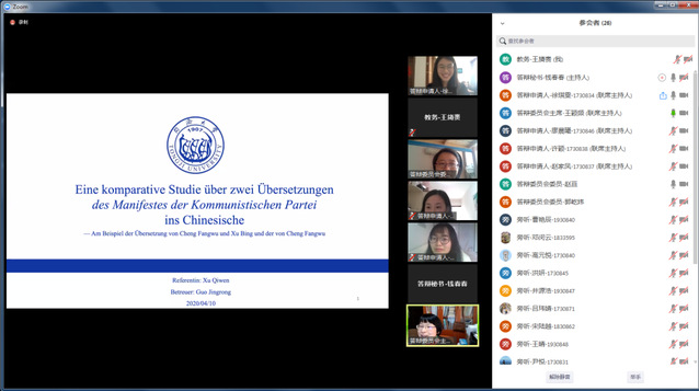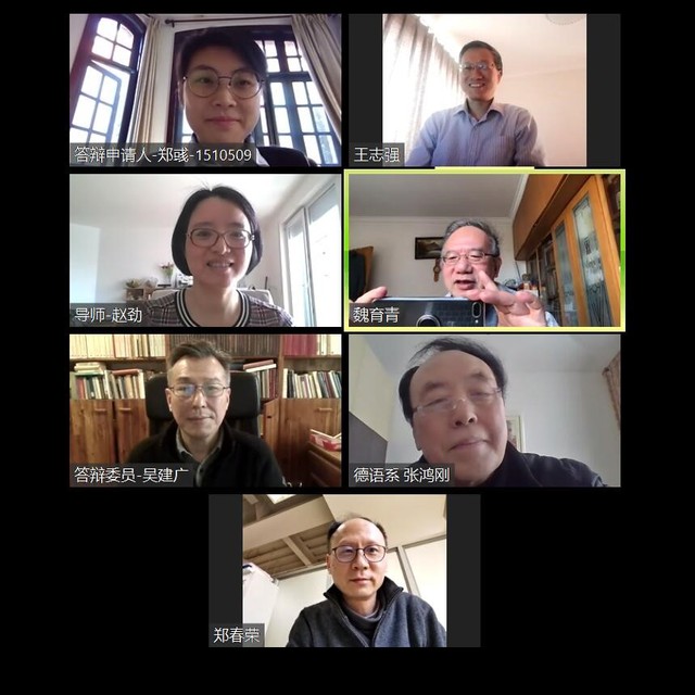2020年4月9日下午14点,外国语学院2015级德语语言文学博士生郑彧通过ZOOM在线视频形式开启了本学位点首场线上答辩并顺利通过。本次答辩邀请了复旦大学魏育青教授担任答辩委员会主席,委员由上海交通大学张鸿刚教授、上海外国语大学王志强教授、同济大学吴建广教授与郑春荣教授组成。德语系助理教授李莎莎任答辩秘书。指导教师赵劲教授列席,近30位师生参会旁听,我校研究生院学位办专人巡会督导。