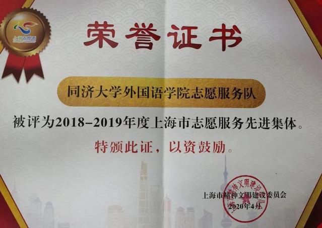 日前,《2018-2019年度上海市志愿服务先进光荣册》发布。同济大学外国语学院志愿服务队被评为2018-2019年度上海市志愿服务先进集体。这是继同济大学外国语学院志愿服务队相继被评为上海市首批“青春上海”品牌志愿服务队和“青春上海”城市文明志愿服务队之后,所获的又一重要奖项。
