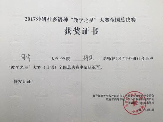 2017年12月7日,由教育部高等学校外语专业教学指导委员会、教育部高等学校大学外语专业指导委员会和外语教学与研究出版社共同举办2017外研社多语种“教学之星”大赛全国总决赛在北京举行。同济大学外国语学院日语系胡琪老师获总决赛日语组亚军。