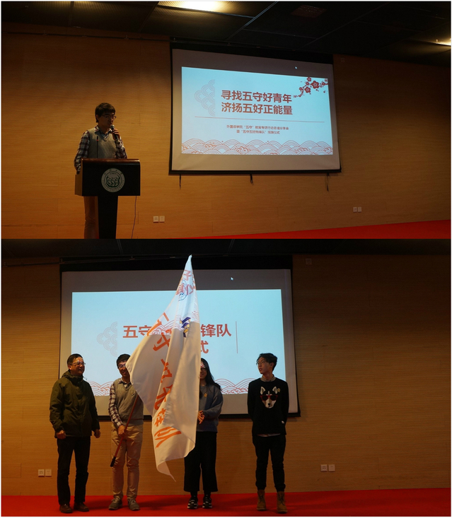 2017年12月26日“寻找五守好青年,济扬五好正能量”外国语学院“五守”教育专项行动总结分享会暨“五守五好先锋队”授旗仪式在经纬楼三楼顺利举行。本学期,为了进一步贯彻全国高校思想政治工作会议精神和习近平总书记关于“立德树人”的重要论述,外国语学院积极响应我校“立德树人”专项行动,发挥党员的先锋带头作用,面向外院学子开展“守时、守序、守信、守纪、守法”教育活动,通过晨读计划、主题班会、知识竞赛、手账作战、班级打卡、制定公约等一系列趣味实践,让同学们亲身参与活动中,不仅收获了乐趣,也深刻体会到了“五守”对于规范生活与学习习惯的重大意义。同济大学党委副书记徐建平、外国语学院党委书记李立贵、校关工委老同志陈立丰老师、外国语学院关工委曹英多老师参加了本次仪式。