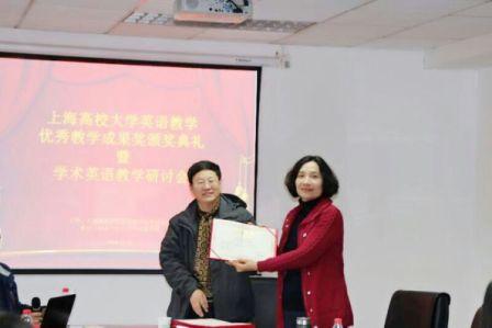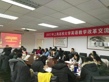 2018年1月5日下午,上海市高校大学英语优秀教学成果奖颁奖典礼暨学术英语教学研讨会在公共英语教学部隆重召开。上海市高校大学英语教学指导委员会主任蔡基刚教授携教指委其他领导、外国语学院副院长宋缨、院长助理朱锡明、公英部副主任蒋琴芳、李兴文以及上海财经大学、复旦大学、华东师范大学、华东政法大学、上海海事大学、上海大学、东华大学、上海理工大学、上海师范大学、上海对外经贸大学、上海中医药大学、上海体育学院、上海海关学院、上海应用技术大学等20多所高校的代表50人参加了会议。