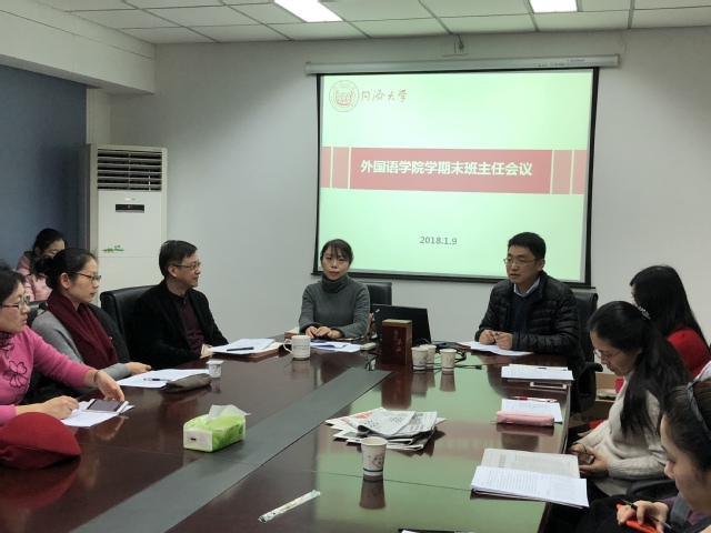 2018年1月9日,外国语学院2017-2018学年第一学期期末班主任会议于同文楼111室召开。学院党委书记李立贵、院长吴赟出席会议并讲话,党委副书记徐伟铖主持会议,学工办老师与各班主任参加了本次会议。