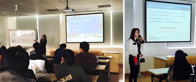 随后,由德意志学术交流中心(DAAD)上海信息办公室的Frau Weikert和Frau Xu,向大家介绍德国高等院校的概况和类型、申请流程等,教大家如何查找心仪的学校,如何准备申请材料和语言资质。