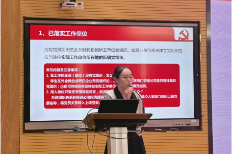 学工办副主任、本科生党支部书记李伟伟就党组织关系转接进行专题讲解,从转接原则和工作要求出发,针对毕业生党员不同去向类型详细解读了组织关系和党员档案转接的重要性与要点。