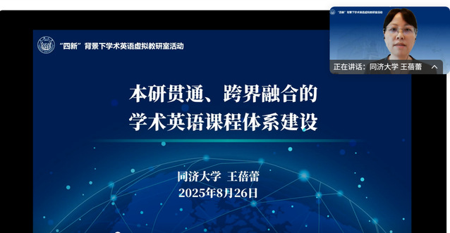 2025年8月26日下午,由同济大学外国语学院主办的本研贯通学术英语课程群虚拟教研室活动在线上顺利召开。来自同济大学、暨南大学、华南理工大学、重庆大学、北京航空航天大学、北京理工大学等多所高校的近九十位外语教师齐聚云端,围绕“四新”背景下的学术英语课程教学展开深入交流。应邀参加本次研讨的专家有教育部虚拟教研室外语类学科协作组组长、暨南大学外国语学院赵雯教授,华南理工大学外国语学院副院长徐鹰教授,重庆大学外国语学院英语系副主任郑尧副教授和北京航空航天大学姜峰教授。活动由同济大学外国语学院副院长王蓓蕾主持,外国语学院院长吴赟教授致辞。