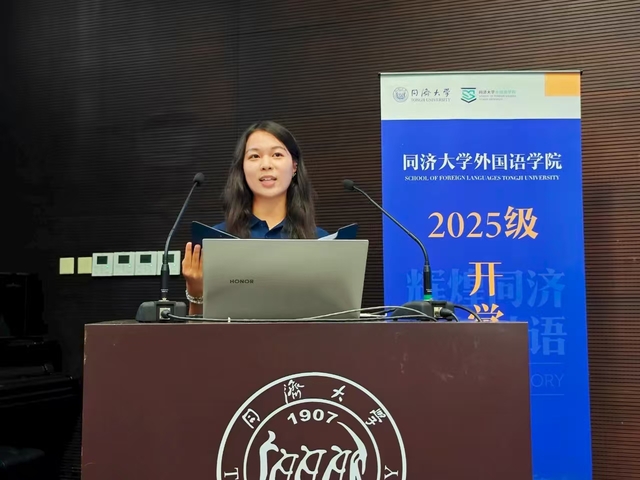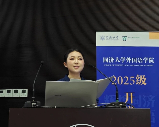 梁欣怡作为本科新生代表发言。她表达了对成为同济外语人的激动与自豪,呼吁同学们以语言为刃,响应国家号召,讲述中国故事,贡献国家软实力建设,在学术与实践的交融中追求卓越,坚定迈向未来。