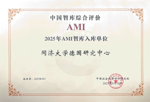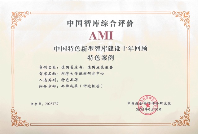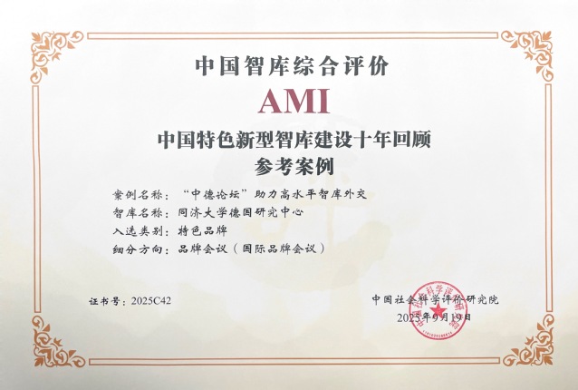 9月19日,由中国社会科学院中国社会科学评价研究院主办的第八届中国智库建设与评价高峰论坛在京举行。论坛发布了“中国特色新型智库建设十年回顾特色案例、参考案例”,同济大学德国研究中心入选“中国智库综合评价2025年AMI智库”名单,中心提交的“《德国发展报告》(德国蓝皮书)”案例入选特色案例(品牌成果)”、“‘中德论坛’助力中德智库高水平外交”案例入选参考案例(品牌会议)。
