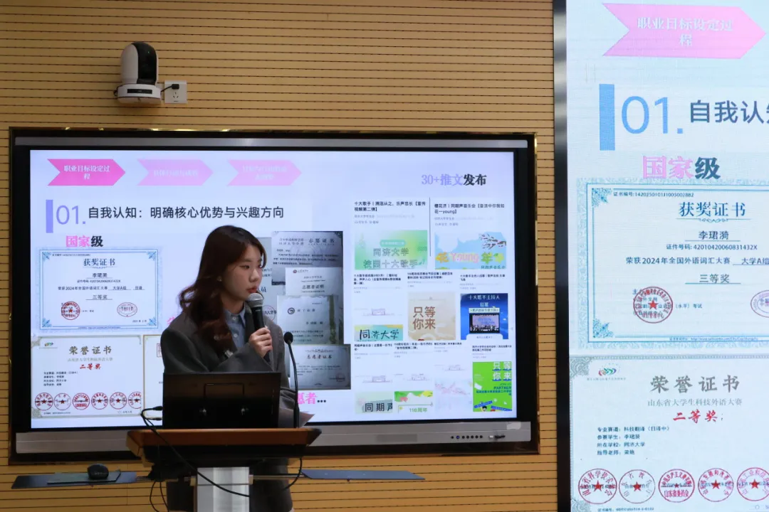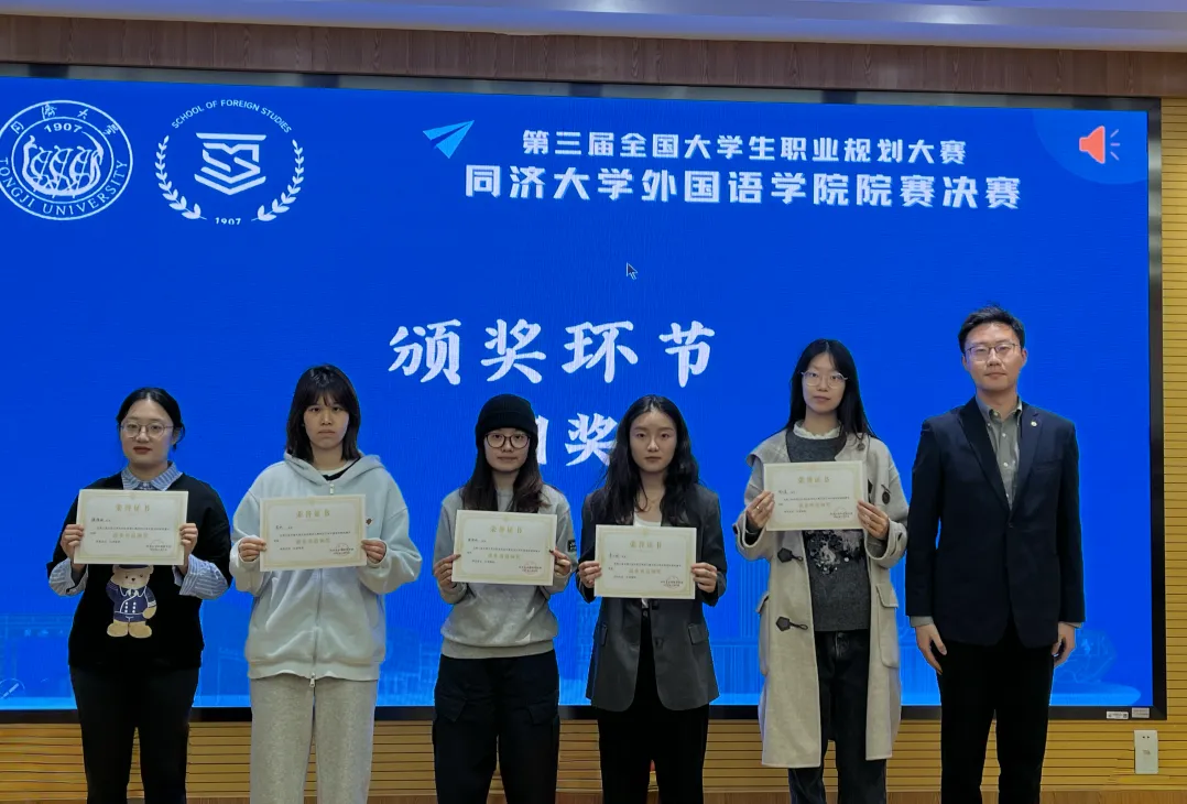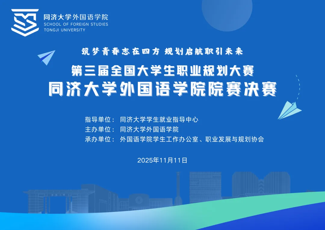 语言是通往世界的桥梁,规划是走向未来的航图。为贯彻落实党中央、国务院关于做好高校毕业生就业工作的决策部署,加强我院生涯教育和就业指导,引导学生树立正确的成才观、就业观和择业观,促进未来职业发展、提升就业竞争力,2025年11月11日,第三届全国大学生职业规划大赛同济大学外国语学院院赛决赛(简称“院赛”)在四平路校区汇文楼518报告厅顺利举行。