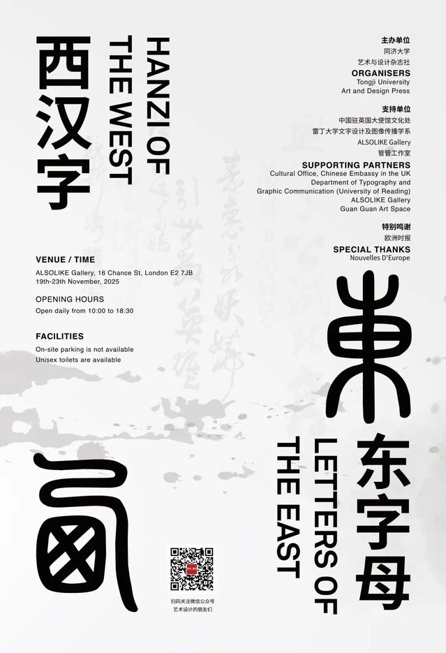 本次展览由中国驻英国大使馆文化处、雷丁大学文字设计及图像传播系、Alsolike Gallery与管管工作室联合支持,并特别鸣谢欧洲时报文化传媒集团。