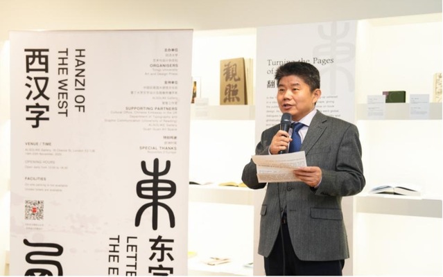 开幕式伊始,中国驻英国大使馆李立言公参发表致辞。他表示,“文字是传承文明的载体,语言是增进理解的桥梁。中文不仅属于中国,也属于世界,是中国人民贡献给全人类的公共文化资产。”他还强调,“本次展览是中英文化合作的交流成果,进一步拓展了文明对话的深度,响应习近平主席提出的‘全球文明倡议’,以文化与创意为纽带,推动中英之间的文明互鉴与人文互动持续深化。”