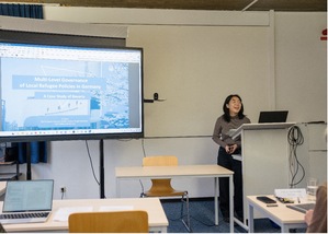 随后,中德青年学者围绕各自的研究方向展开了为期两天的精彩学术汇报。本次研讨会共设立了六个专题。围绕“语言批评与话语分析”专题,青年学者探讨了德国气候外交政策的转向、德国媒体中的难民话语、德国右翼民粹政党话语特征等问题。在“环境话语”专题,青年学者利用主题模型和情感分析等数智人文方法研究了氢能、清洁能源合作以及可持续城市发展等相关话语的特征。“经济话语”专题聚焦政治话语中的“全球化”概念、中德媒体对双边经济关系的报道,欧盟与中国在电动汽车贸易争端中的政策转向。在“政党与治理”专题,青年学者分析了数字技术与欧洲右翼民粹主义的兴起、德国政治“防火墙”的概念变化以及巴伐利亚州的难民政策治理。围绕“国际关系话语”,青年学者讨论了德国在欧洲的领导角色变化、德国政界对“全球南方”的概念建构以及国际关系等政治术语的机器可理解性问题。在“跨文化传播与多样化话语”专题涉及AI辅助翻译软件的文化特异性优化、科学家团队生命周期、AI专利的文本复杂性等问题。论坛期间,现场学术氛围浓厚,讨论环节尤为激烈。与会专家学者对每个报告都进行了深入点评与热烈交流。