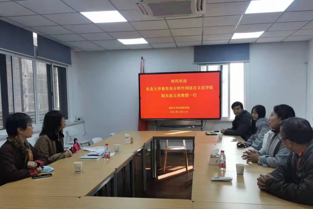 2021年12月31日上午,东北大学秦皇岛分校外国语言文化学院院长赵玉荣教授一行到访我院,对外语学科建设及特殊人群话语研究进行专题调研。外国语学院院长吴赟教授、副书记黄立鹤副教授、英语系系主任杨小虎教授、老龄语言与看护研究中心张惟研究员及王婷副教授、董菁副教授参与调研。
