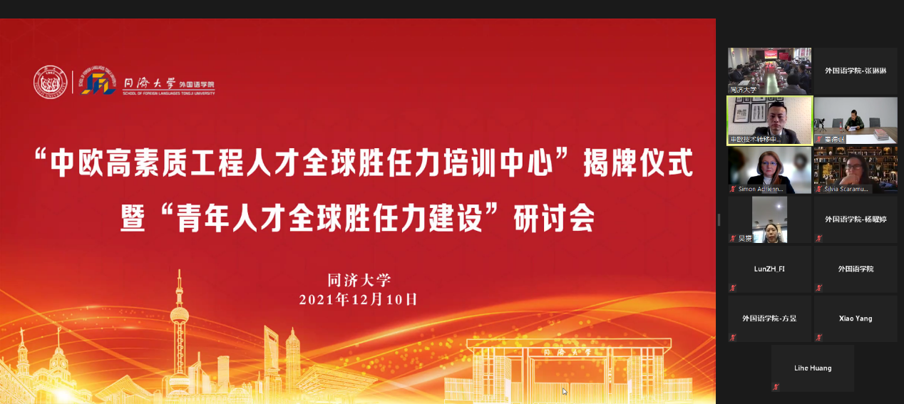 12月10日下午,同济大学“中欧高素质工程人才全球胜任力培训中心”揭牌仪式暨“青年人才全球胜任力建设”研讨会在同济大学逸夫楼和云端同步举行。同济大学副校长、上海市科协副主席顾祥林,中国科学技术出版社党委书记、董事长、总编辑秦德继,中国教育发展战略学会国际胜任力培养专委会理事长张宁,匈牙利匈中友协原副会长、匈牙利政府匈中首席翻译Adrienn Simon,匈牙利中欧商会中欧技术转移中心主任魏巍,意大利佛罗伦萨大学孔子学院理事长Silvia Scaramuzzi出席并致辞。顾祥林、同济大学科研管理部部长冯世进和外国语学院院长吴赟为中心揭牌。同济大学外事办公室、科研管理部、文科办公室、本科生院、研究生院、学研工部、德国研究中心、法语区域研究中心等职能部门和研究机构负责人,以及外国语学院师生代表参加研讨。