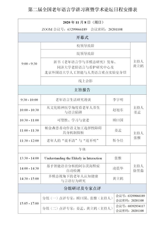 注:本次会议主要以线上方式举行,若有意赴同济大学线下参会并参观同济大学老龄语言与看护研究中心,请于2020年10月31日前与会务组联系,会务组将视具体情况发送电子邀请函。线下参会者须符合同济大学疫情防控规定,食宿安排及费用均自理。