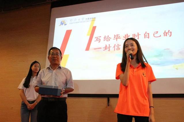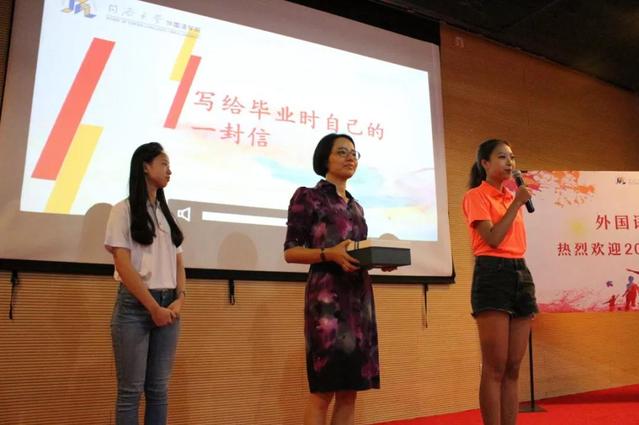 “给自己的一封信”环节掀起了开学典礼的高潮。外院新生郑重地写下了给毕业时自己的一封信,在开学典礼的现场将信箱传递给各系老师代为保管,一起见证未来的追梦之旅。德、日、英各系系主任接过盛满梦想与希望的信箱,并做新生寄语。