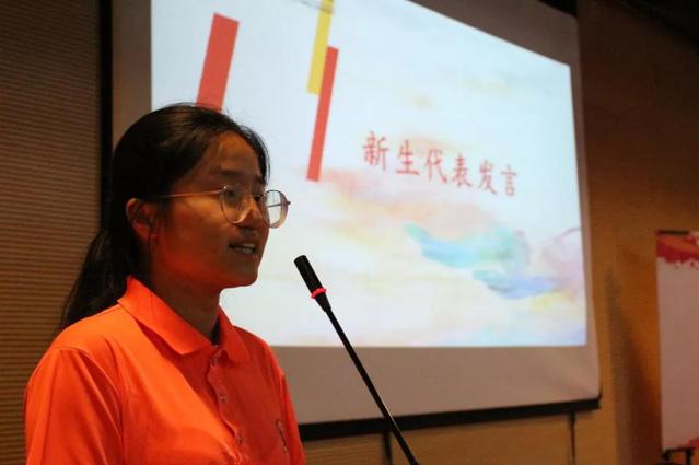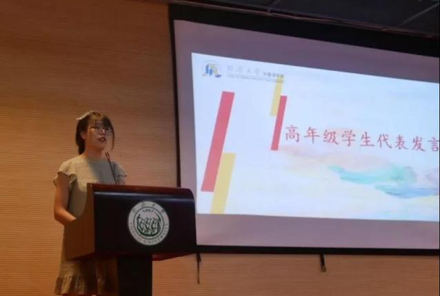 2017级德语系研究生童颖作为老生代表发言,她鼓励新生利用大学中的资源和机会,探索可能性,寻找兴趣之所在,坚持不懈地努力;同时学习科学的时间管理方法,平衡好学习、工作和生活。
