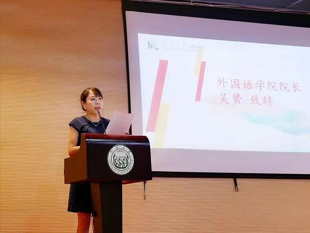 外国语学院院长吴贇代表学院向新生致欢迎辞,她表示大学生活中的变化与挑战意味着进步与新生。她叮嘱新生要瞩目远方,心怀梦想;穿过黑夜,拥抱阳光。始终做活泼的年轻人,始终保持纯净的心灵;始终深入读书与思考,参与中国与世界的对话,解答世界对中国的困惑。