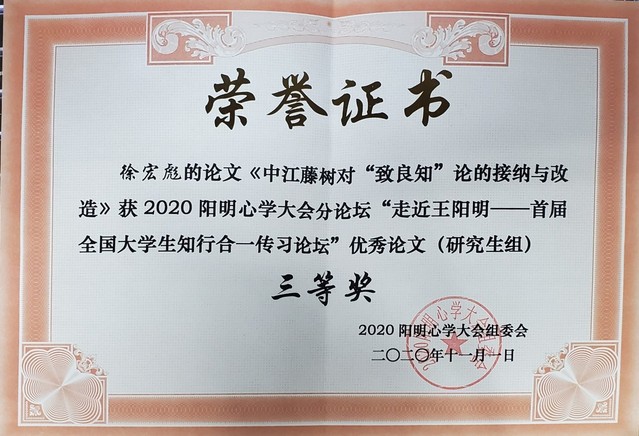 11月1日,大会召开了“走近王阳明——首届全国大学生王阳明知行合一传习论坛”,通过第一轮遴选后,共有来自全国各大高校的96名大学生参会。我院日语系硕士一年级研究生徐宏彪,在导师陈毅立的悉心指导下,撰写了论文“中江藤树对‘致良知’论的接纳与改造”(全文约8500字),荣获研究生组优秀论文三等奖,论文被收入《王阳明知行合一传习论坛论文集》。