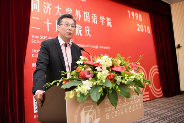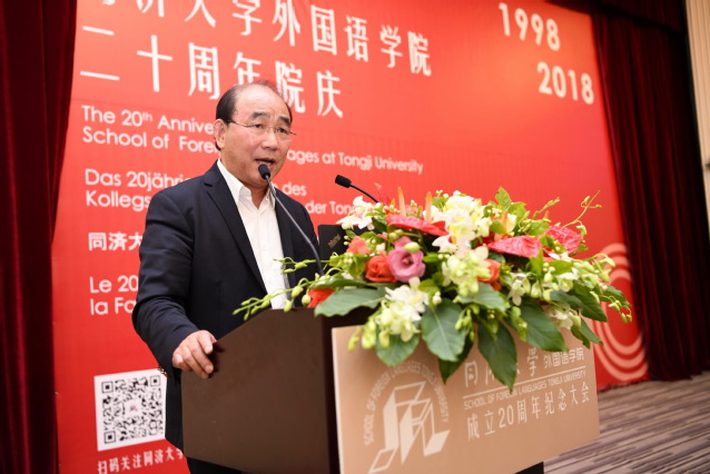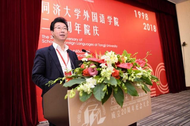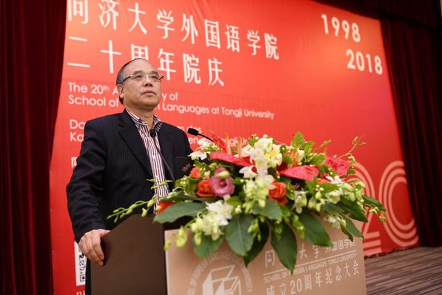 上海外国语大学英语学院院长査明建,代表上海外国语大学和兄弟院校的外语学院对同济大学外国语学院成立二十周年表示祝贺。他讲述现在社会语言教育、人文教育有了新形势和新变革,对外国语学院的发展提出了更高的要求。查建明表示愿与外国语学院和社会各界一起同舟共济,共创外语学习教育研究的新局面。