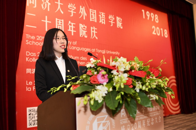 同济大学学生会主席,日语系学生张轶阳发表讲话,讲述外国语学院对自己的深刻意义。她从自身经历出发,讲述外国语学院对外院学子提供的机会和支持。她代表外院学生承诺会时刻要求自己,不忘初心,砥砺前行,做一个优秀的同济大学外国语学院学子。