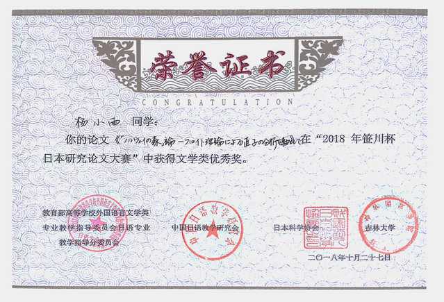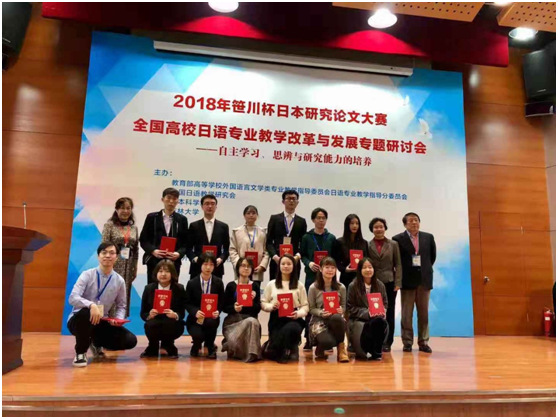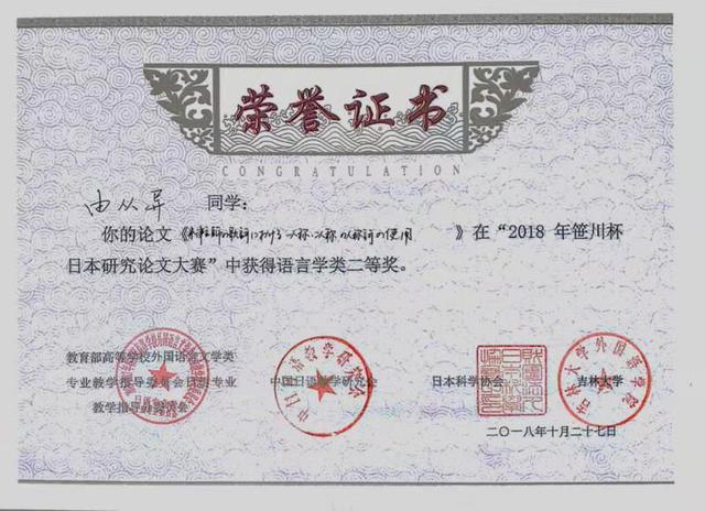 2018年10月26日,“笹川杯日本研究论文大赛”决赛在吉林大学举行。日语系2015级学生由从异同学荣获语言学组二等奖,杨小雨同学荣获得文学组优秀奖。日语系刘晓芳老师、张颖老师荣获“优秀论文指导教师奖”称号。